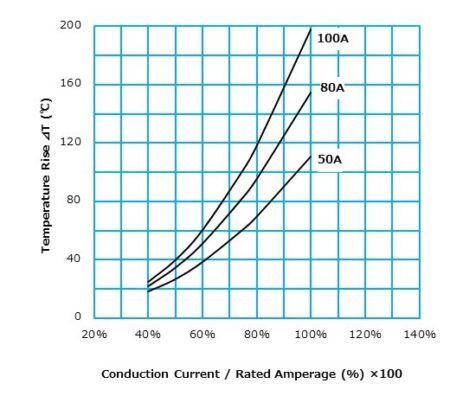 - The power loss and the temperature characteristics are studied using an FR-4 board (one-side board) and a 35-μm-thick copper foil with a copper foil width of 2mm/A depending on the rated amperage (e.g. 50 mm width for a product rated at 100 A).
